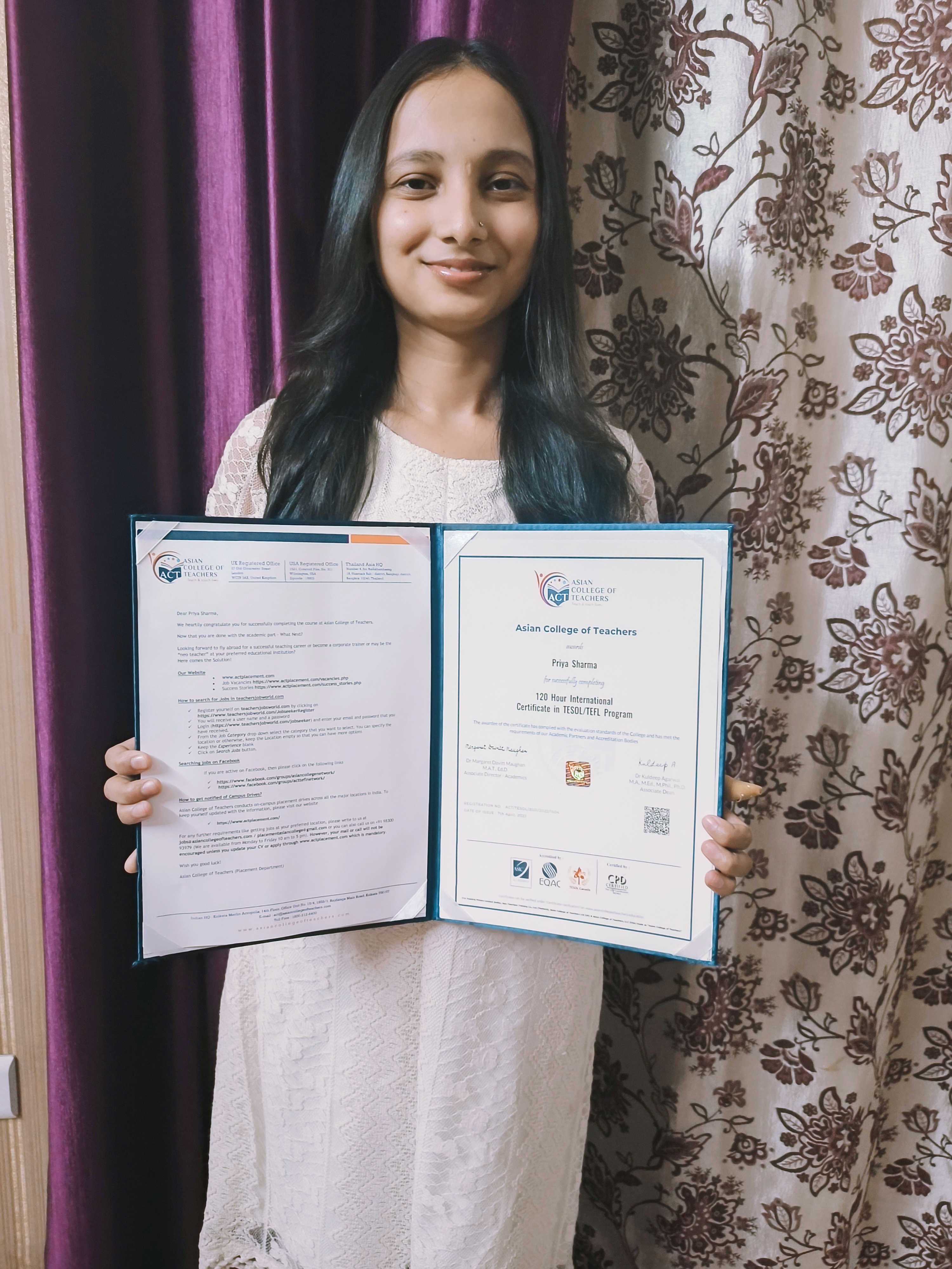 I finally received my 120 Hour TESOL certificate today. I would like to take this opportunity to thank Annie Joseph mam, Shounak Sir and Aloka Nanda ma'am for their guidance in every stage of the course. I am really looking forward to working and gaining experience in the teaching field as an ESL teacher and fortuity to work in different countries. Thank you so much ACT teachers and team.